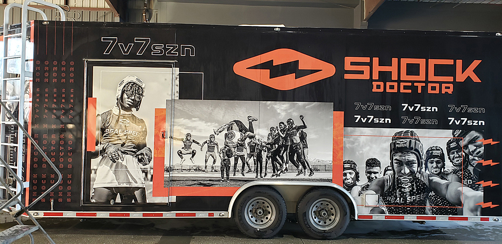 doors of the back trailer with special attention to light cluster and warning signs.