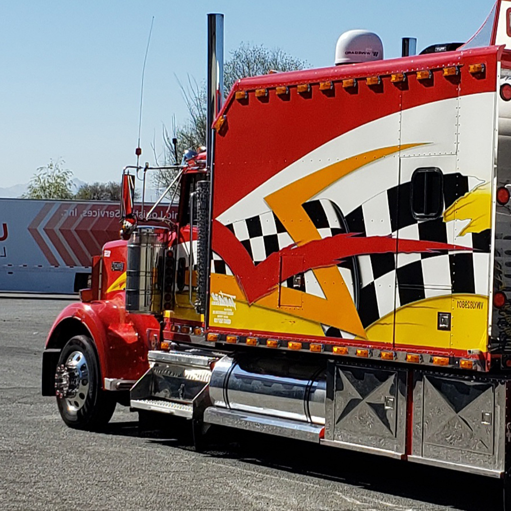 front and sides of cab, chrome exhaust stacks, wheels, fuel tanks, mud guards, tool boxes and rear
